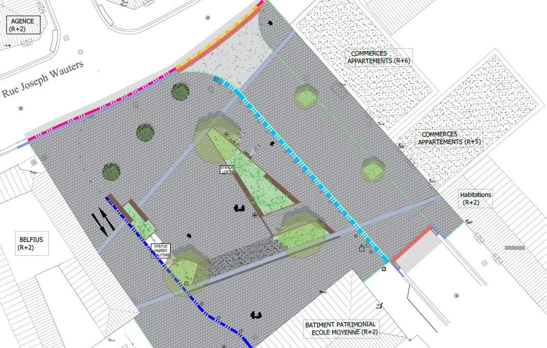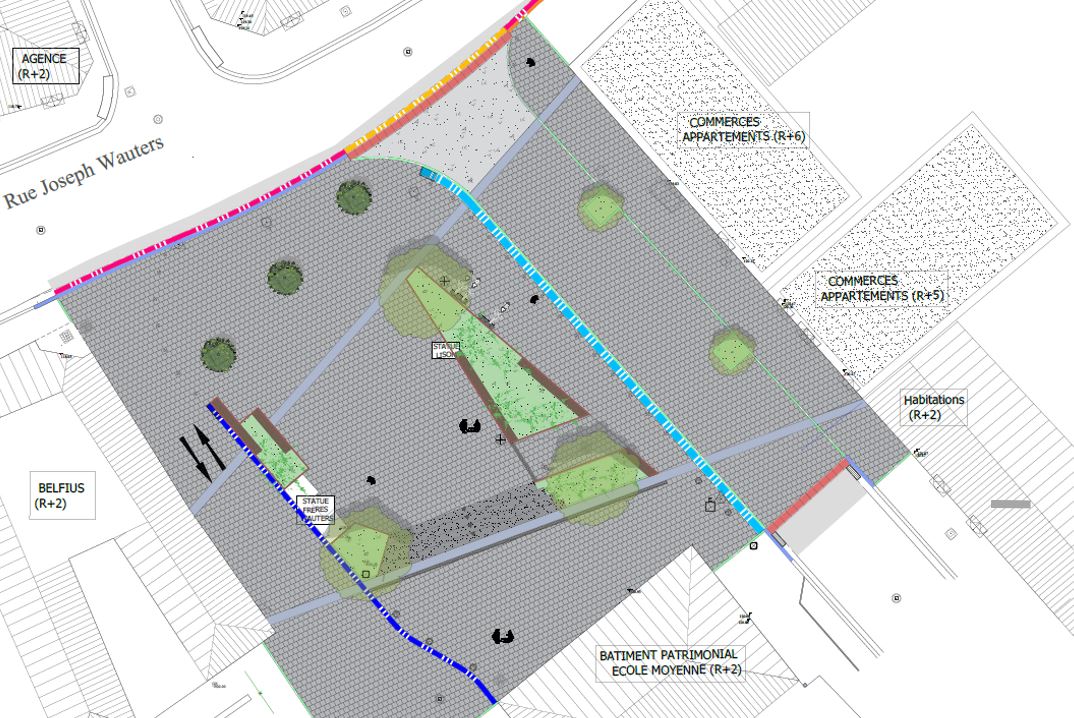 Le réaménagement de la Place de l’Ecole moyenne à vise à créer un nouvel espace public convivial et végétalisé, reliant de plain-pied les commerces, l’école et le centre culturel. Grâce à une nouvelle configuration du relief, l’utilisation de matériaux homogènes et l’intégration d’une rampe PMR, le projet garantit une accessibilité optimale et une circulation simplifiée pour tous. Ce nouvel îlot de vie, intégrant du mobilier urbain moderne, une gestion optimisée des eaux et de nouvelles plantations aérées, redynamisera le centre-ville tout en respectant un cadre sobre et esthétique.
