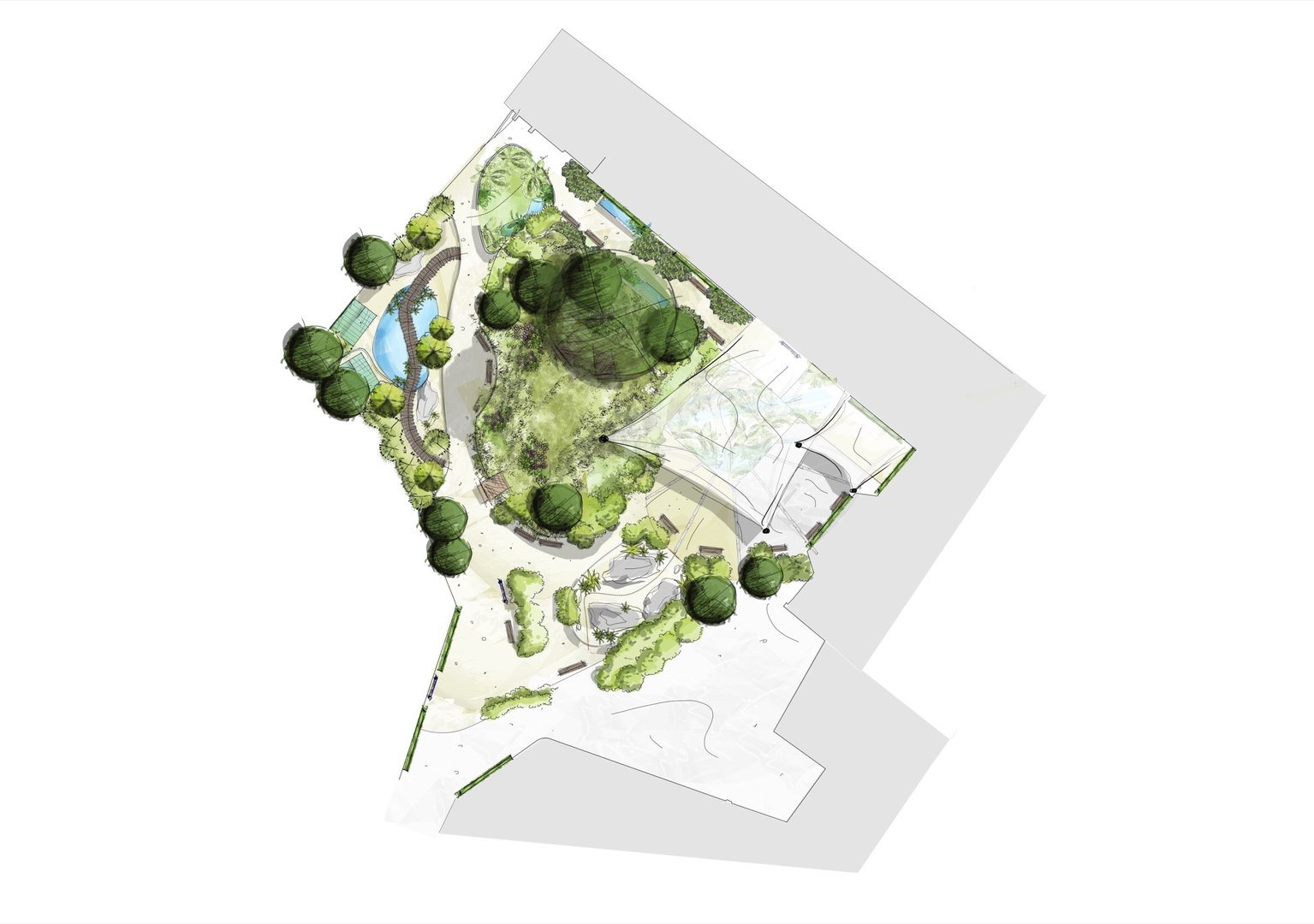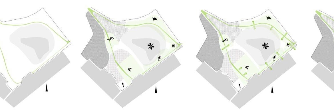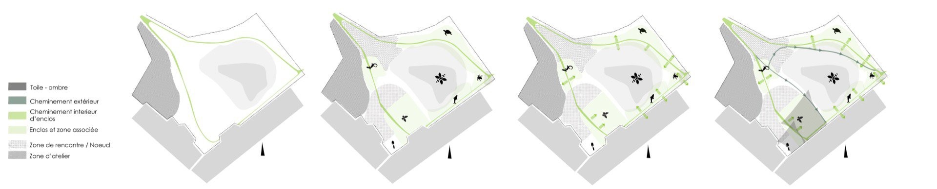 L’esquisse propose un aménagement en espace de détente, de découverte et déambulation. Le visiteur pourra s’informer (soit en parcours libre ou guidé, soit au moyen d’activités pédagogiques) et découvrir les habitats présents au travers d’une communication et d’une sensibilisation à la protection et la conservation de la nature. Le jardin s’articule autour de différentes zones thématiques : la serre aux papillons, la zone pédagogique de fouilles, les bassins, l’espace reptiles, l’espace tortues, l’espace amphibiens, le rucher (la butte) et le jardin mellifère.