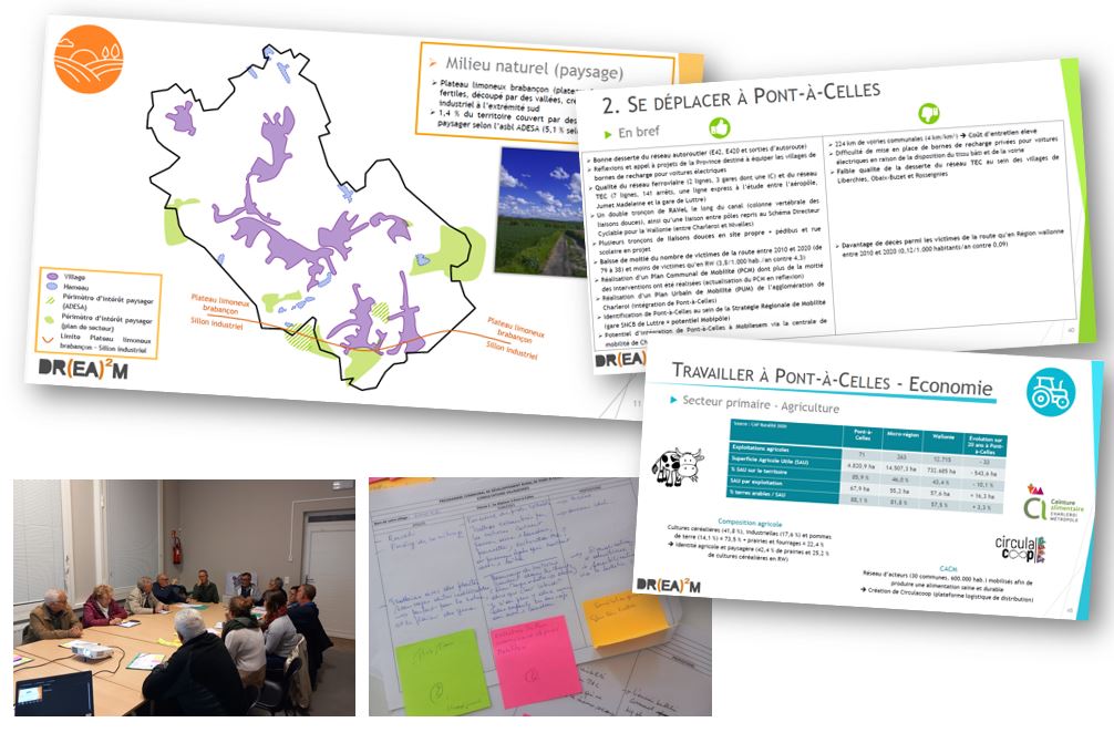 Suivant la procédure établie par la région, la mission a débuté par un diagnostic du territoire de l’entité, portant sur une multitude de thématiques : de l’aménagement à la mobilité, en passant par l’environnement et socio-économique. Celui-ci a ensuite été présenté dans les 8 villages de l’entité.