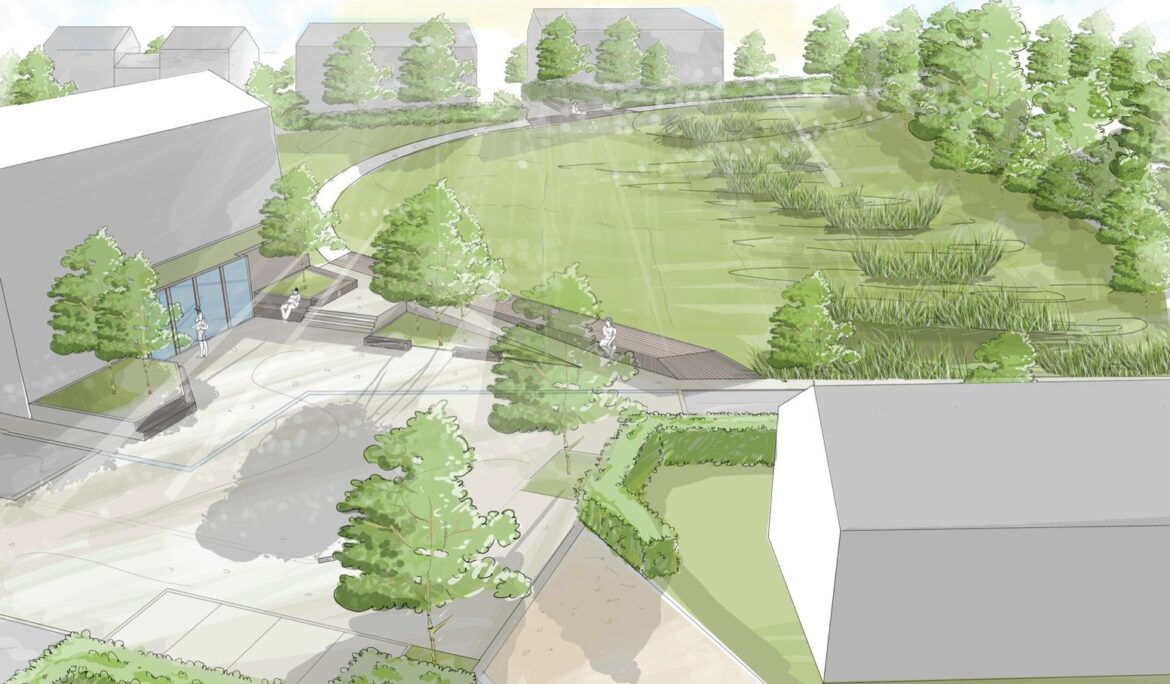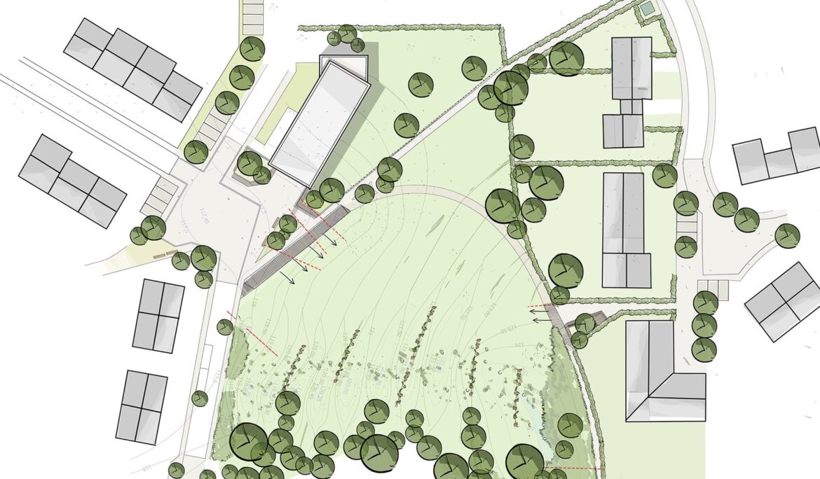 Le projet du permis d’urbainsation de la zone comprend l’aménagement d’un parc de plus de 0,5 hectares et l’aménagement de deux petites placettes situées en périphérie de celui-ci. Afin de répondre aux enheux des eaux de ruissellement, l’espace public, et plus particulièrement la zone de parc, le projet propose de soulager la situation future avec la réalisation de différentes moraines sèches se relayant. Cela permettra une infiltration des eaux de ruissellement et une rétention partielle de celle-ci. La zone partiellement humide proposée contribuera à renforcer la biodiversité et les qualités paysagères du site. Les placettes seront traitées comme des espaces partagés et sécurisés créant un lieu propice aux rencontres.