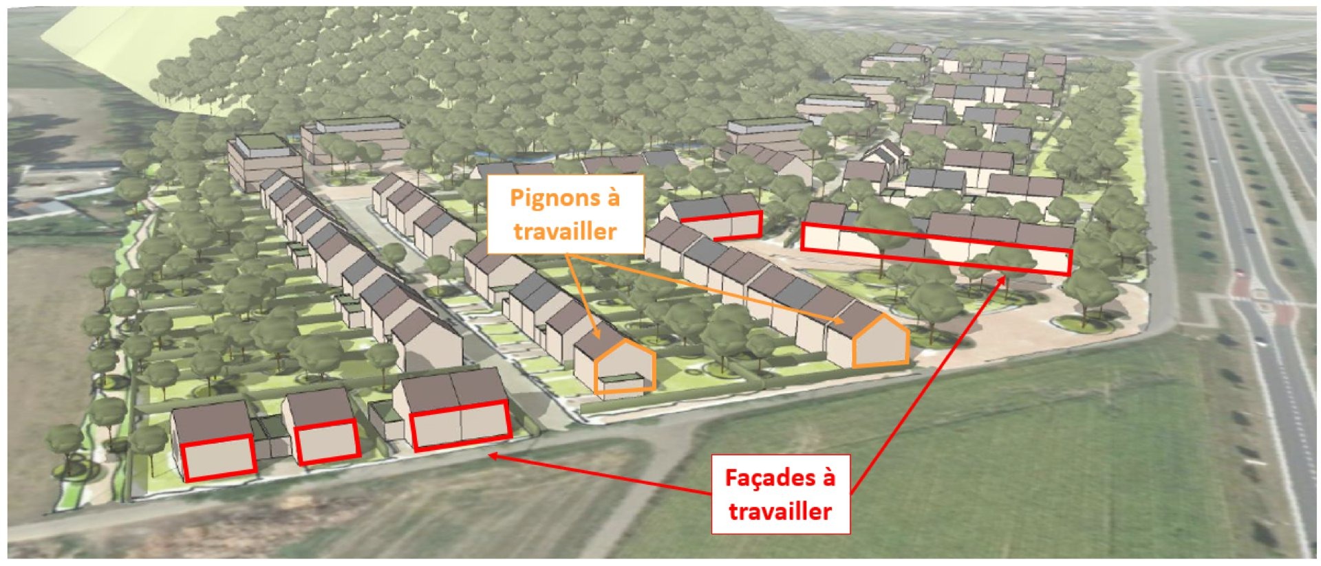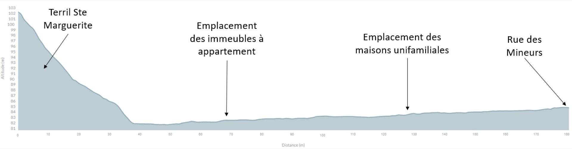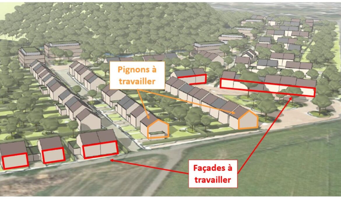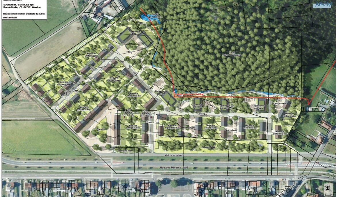 Le projet prévoit la création de 120 à 170 logements sous la forme de 60 à 80 maisons unifamiliales et de 60 à 90 appartements. L’ensemble de ces logements est desservi par des voiries en espace partagé reliant des voiries existantes. Une zone humide est prévue pour la collecte des eaux de pluie, elle recevra un traitement paysager comprenant un traitement adapté des berges ainsi que des plantations adaptées au milieu. La particularité de ce projet est qu’il se situe au pied d’un terril, dans le village de Péronnes-lez-Binche. Celui-ci est donc entouré à la fois d’un terril, d’une cité, de quartiers résidentiels, de surfaces agricoles, et d’une route régionale. L’accès y est actuellement compliqué via les ruelles situées au nord, l’étude a donc proposé de créer de nouveaux accès vers le quartier.
