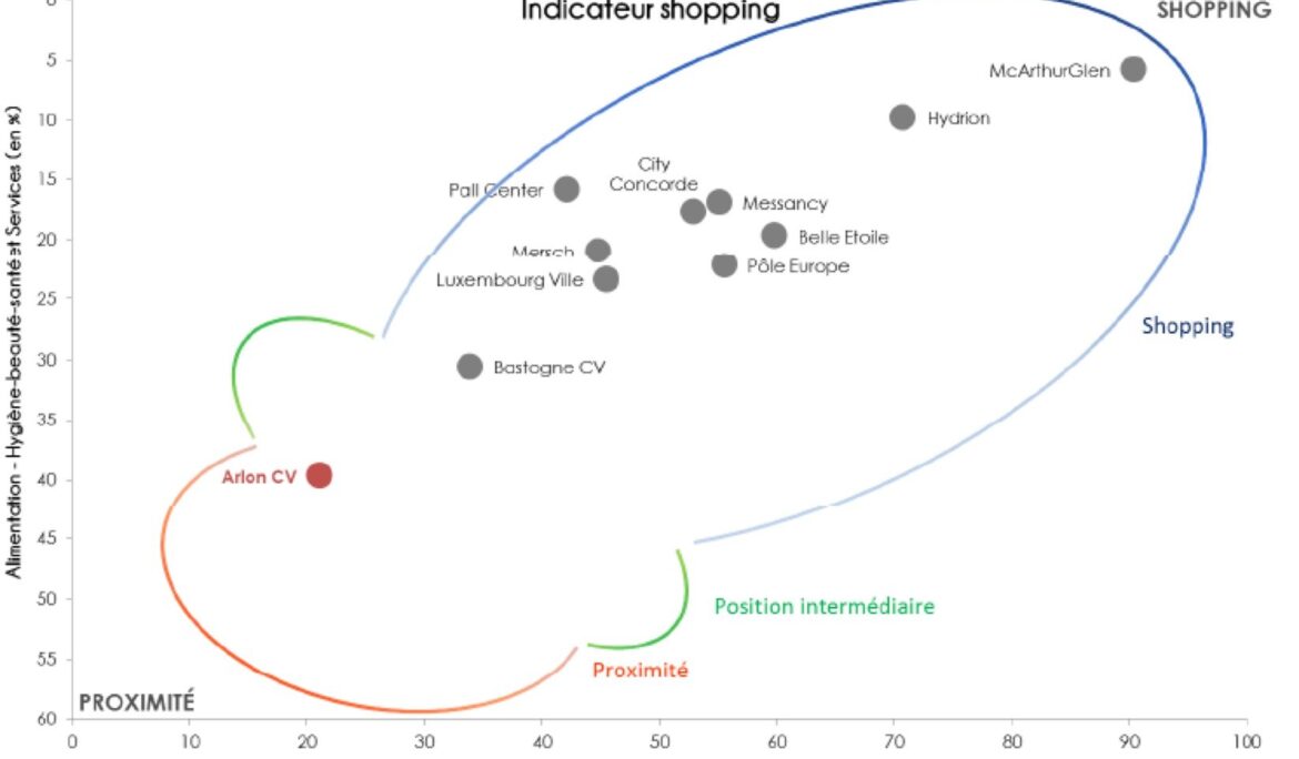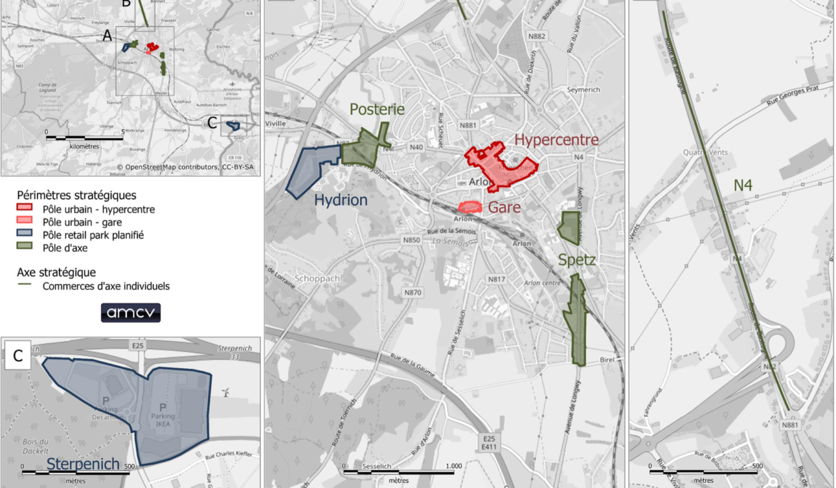 Le schéma communal de développement commercial vise à définir des périmètres au sein desquels l’offre commercial de la commune s’est développée. Le développement futur devra se faire à l’intérieur de ces périmètres et suivant des objectifs précis en fonction des types de commerces voulu. Le commerce à Arlon a connu une développement commercial important, qui se poursuit à l’heure actuelle avec les retail park de Sterpenich et de l’Hydrion. Un enjeu important dans la ville est également la possibilité de relocalisation de l’hôpital, actuellement situé à proximité du pôle commercial de la Spetz.