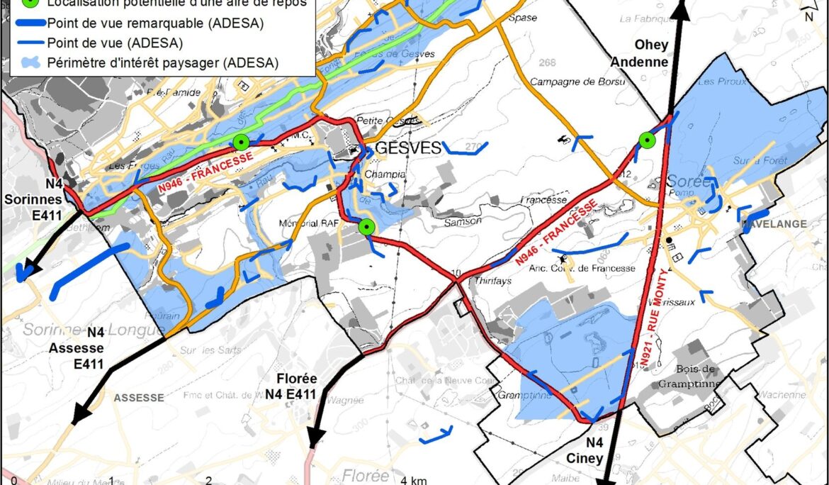Un schéma des déplacements à l’échelle territoriale a été réalisé dans le cadre du schéma de structure communal de Gesves, Il a permis de hiérarchiser les différents types de voiries. Différentes mesures d’aménagement ont également été proposées, comme la sécurisation de certains carrefours, la traversées de villages, l’aménagement de parkings, d’aires de repos, d’effets de porte, ainsi que le balisage des sentiers.
